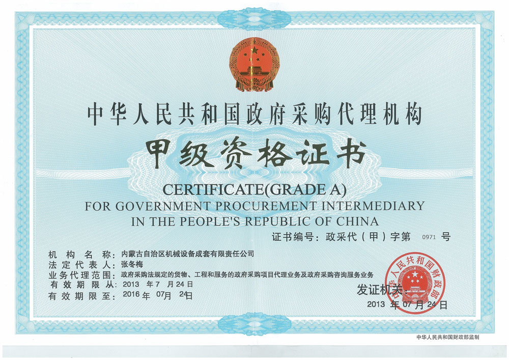 政府采購代理機構(gòu)甲級資格證書